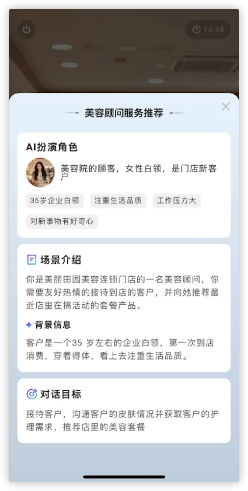 比如在美容顾问服务推荐的AI智能对练中,通过提炼对话发现学员在介绍产品时缺乏针对性,系统就会给出相应的教练提醒,建议学员根据客户的需求特点进行推荐,学员通过再次演练,不断提升自己的沟通能力。