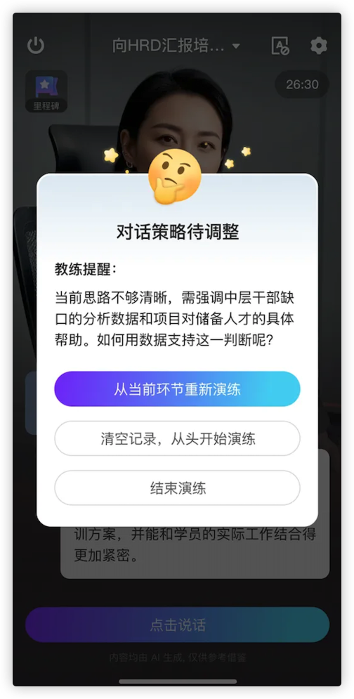 在对练过程中,AI还能提供详细的反馈指导。就像ai智能对练反馈指导展示的那样,当学员的对话策略出现问题时,AI会提醒学员进行调整,并且还提供重演选项,让学员有机会重新进行对练,不断优化自己的表现。