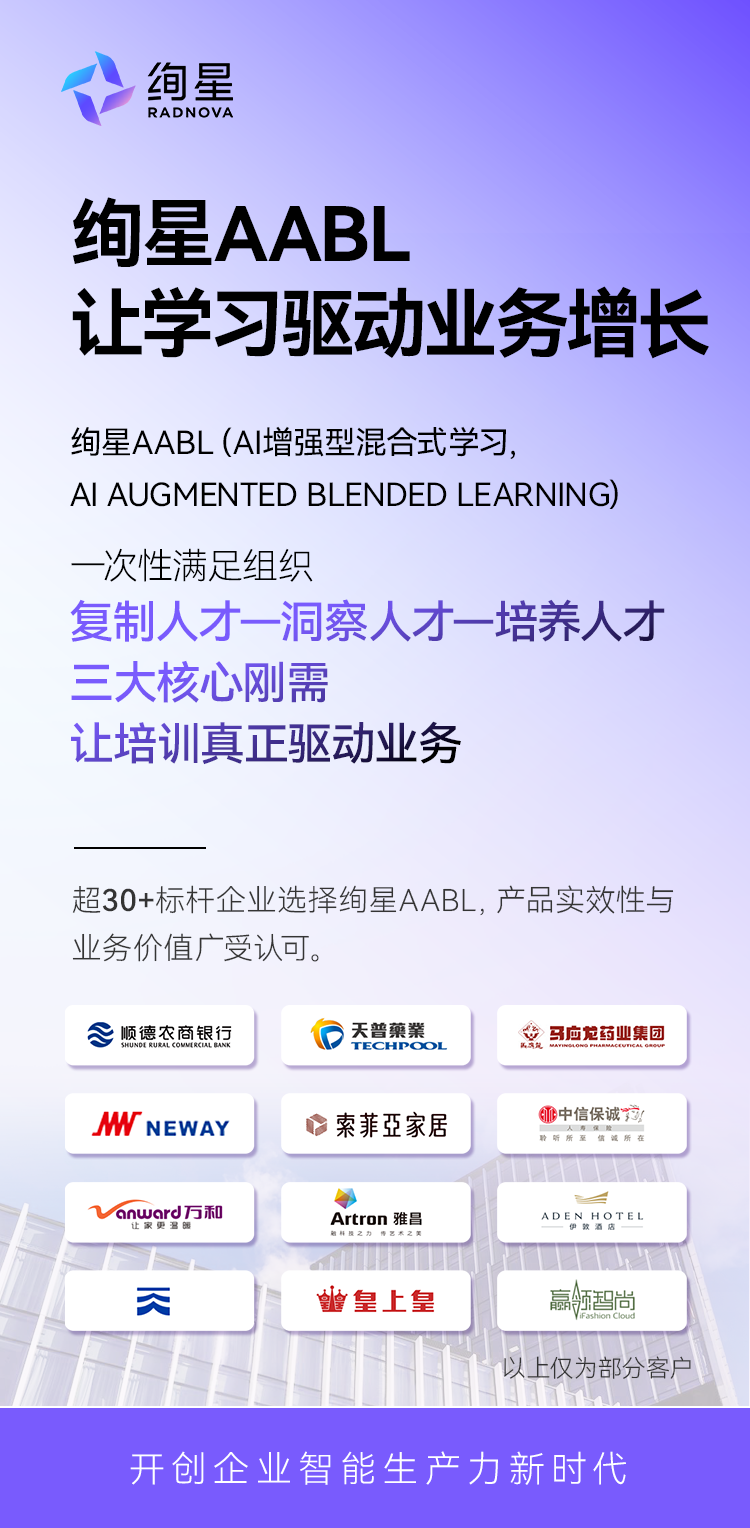 2025年,绚星智慧科技正式推出绚星AABL(AI增强型混合式学习,AI-Augmented Blended Learning),将AI技术深度融入组织发展场景,打造面向企业培训与人才发展的创新解决方案。以AI场景化对练、全过程观测、个性化学习路径等为核心,构建“培训×AI”的全新学习闭环,让人才成长更可量化、与业务更贴合。