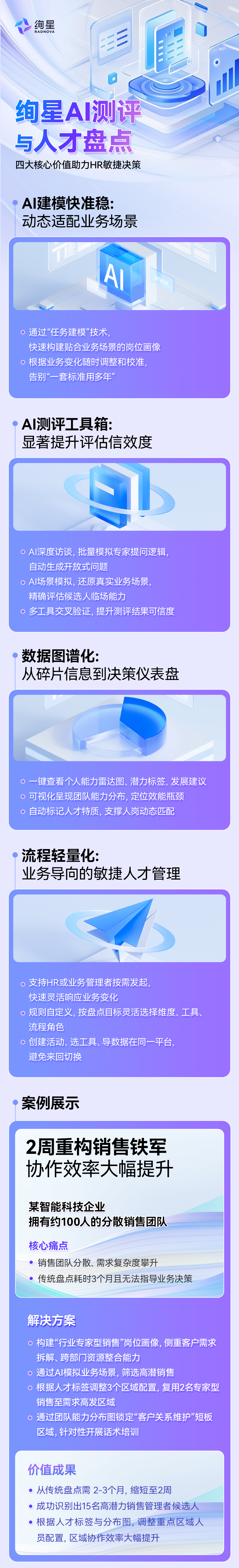 绚星AI测评与人才盘点以AI驱动,帮助HR快速破解这些难题——仅需2周即可完成精准盘点,科学识别高潜人才,数据直观支撑决策,成为企业打造高质量人才梯队的“智能指挥舱”。